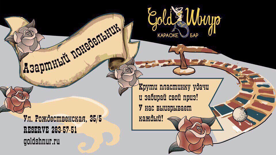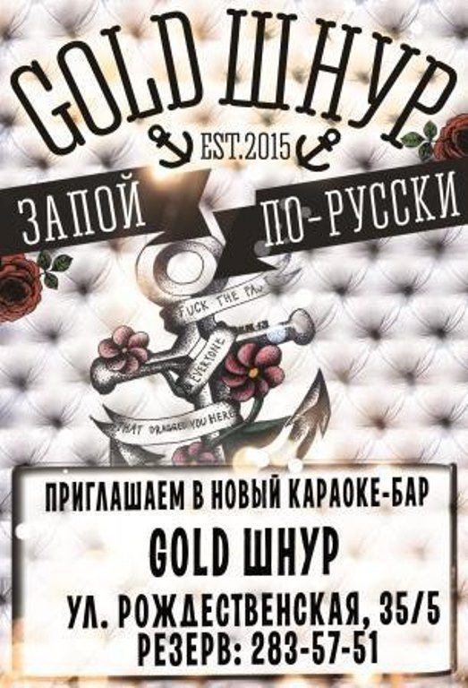 Караоке-бар Gold шнур на Рождественской улице 35 - это особое место, где вы сможете как следует отдохнуть. Мы предлагаем вам провести вечер за исполнением популярных песен и ненадолго почувствовать себя звездой. С нас - богатый и разнообразный каталог и вместе с тем вкусное меню и напитки. С вас - сообщить исполнителя и название трека нашему сотруднику и повеселиться от души.